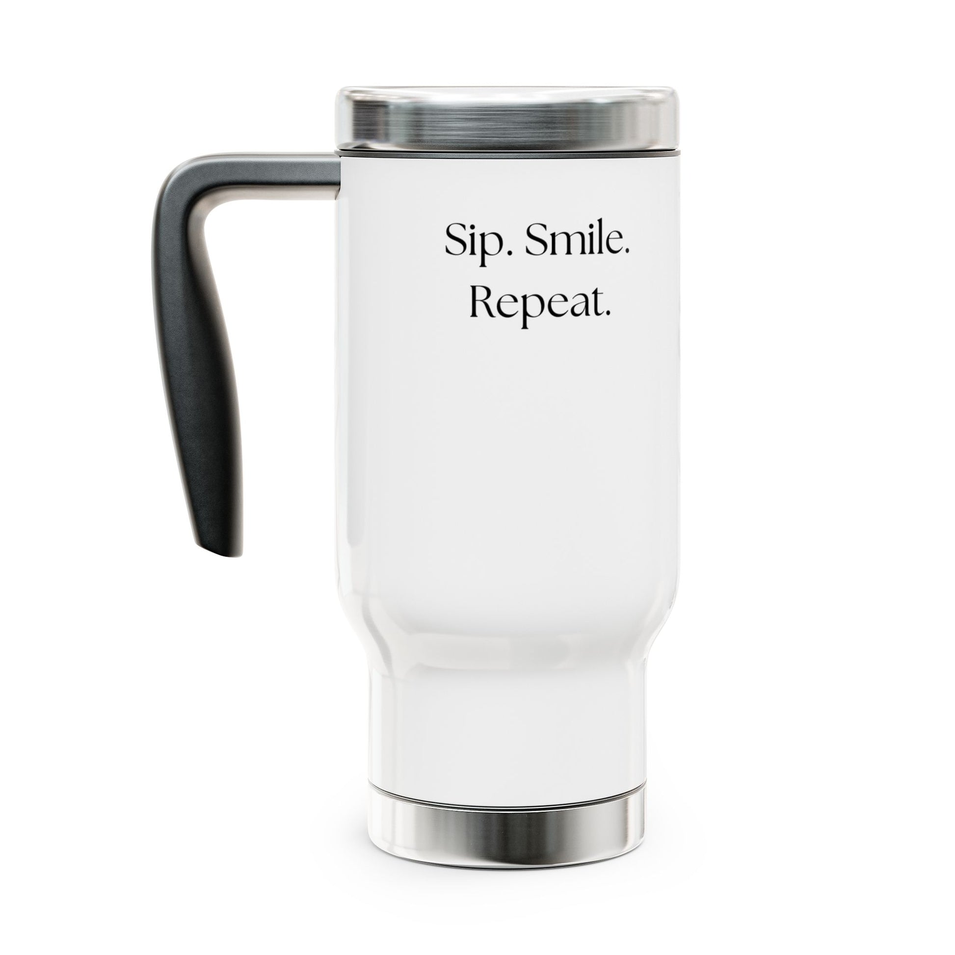 Meet our stylish Stainless Steel Travel Mug—designed for those who are always on the move! This sleek and versatile mug keeps your favorite beverages at the perfect temperature while boasting a glossy finish that adds a touch of sophistication. Adorned with the simple yet meaningful reminder “Sip. Smile. Repeat.” it encourages you to embrace life’s little moments, one sip at a time. Whether you're powering through a busy morning, commuting to work, or unwinding in the evening, this mug is the perfect companion for coffee lovers, tea enthusiasts, and anyone who values quality drinkware. A great gift for Christmas, New Year’s, birthdays, or just because—bring warmth, style, and a smile to your daily routine!